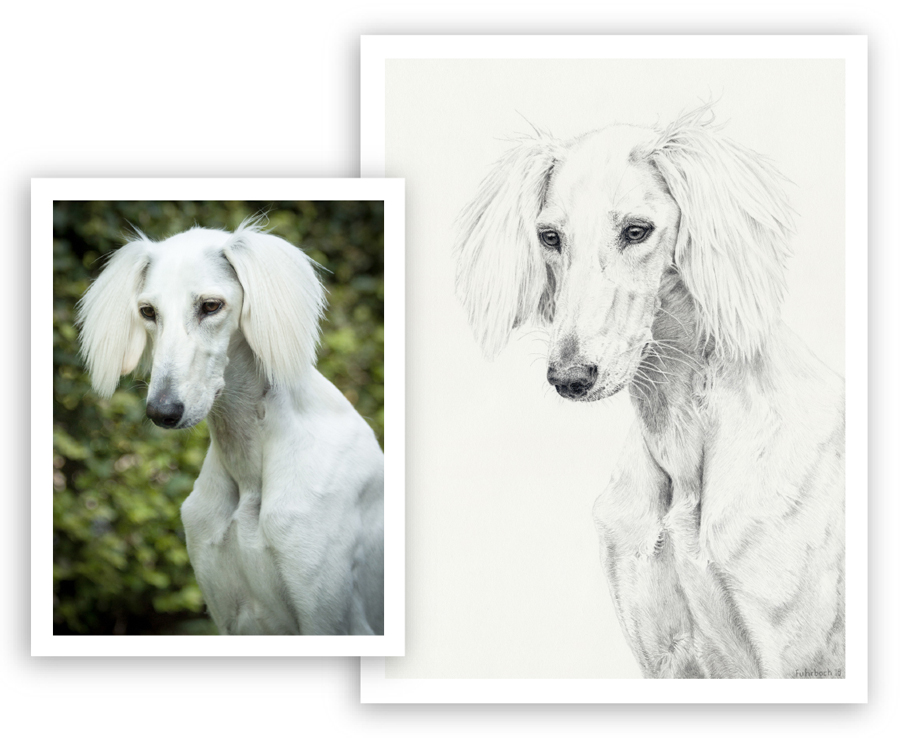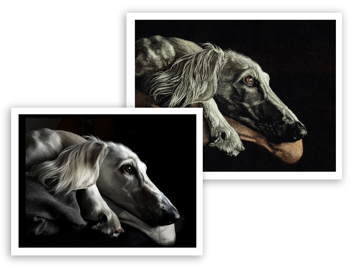 Wie man sieht habe ich hier nicht das Bild so wie es war abgezeichnet. Zum einen ist das Foto nicht überall scharf, zum anderen wollte ich andere Lichtverhältnisse darstellen: das Foto ist an einem Wintertag aufgenommen, mit kühlen diesigen Farben. Stimmungsvoll und auch hübsch, ABER ich wollte den Hund diesmal lieber in seinen natürlichen Farben darstellen. Er hatte so ein schönes warmes, kräftiges Rot. Um die Farbe richtig darzustellen habe ich auf andere Fotos zurückgegriffen, die seine natürliche Farbe darstellten.
